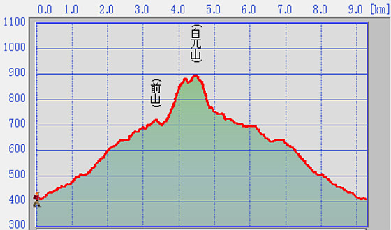 923mピークに達したところで、コースミスをしてしまった。本来ならばそこから右手に折れるべきなのだが、歩きやすいきれいな尾根が直進方向にずっと続いていて、そこを直進してしまったのだ。恐ろしいもので、本人は正しいコースを歩いていると思っているので、940mピークで「あれ、標高が違うしチャムラン山の会の山名標識もないし、おかしいなあ」と思いながら先に進むと、尾根を下り始めるところまでさっさと歩いてきてしまった。さすがにおかしいと思ってGPSと地形図を見比べると、一本違う尾根を登ってきてしまったことにようやく気付いた。これはかなり情けない。